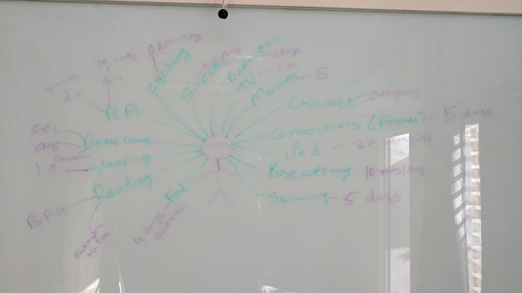 To make him understand that there is finite amount of time, the next task was to list frequency of each action. For example: Swimming was listed 5 days out of 9. Cricket was listed everyday. Cycling 6 km was 2 days in a week. Doing study revision was 1 hour per day. We even decided to have 4 days food in restaurant.