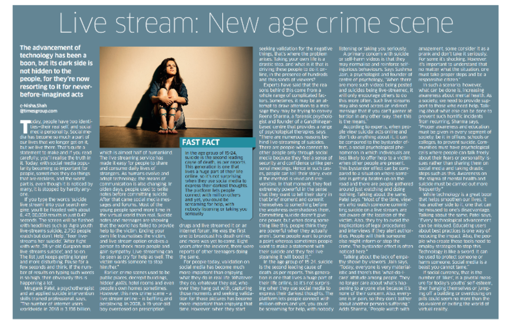 Mrugank Patel, a psychotherapist and an applied suicide intervention skills trained professional, says, “The number of internet users worldwide in 2018 is 3.196 billion,which is almost half of humankind. The live streaming service has made it easy for people to share and consume daily lives of strangers. As humans evolve and adopt technology, the means of communication is also changing. In olden days, people used to write notes before committing suicide. After that came social media messages and forums. Most of the young people spend more time in the virtual world than real. Suicide notes and messages are showing that the world has failed to provide help to the victim. Ending your own life traumatises the victim, and live stream option enables a person to shock more people and gain sympathy. Live-streaming can be seen as cry for help as well. The victim wants someone to stop him/her.”